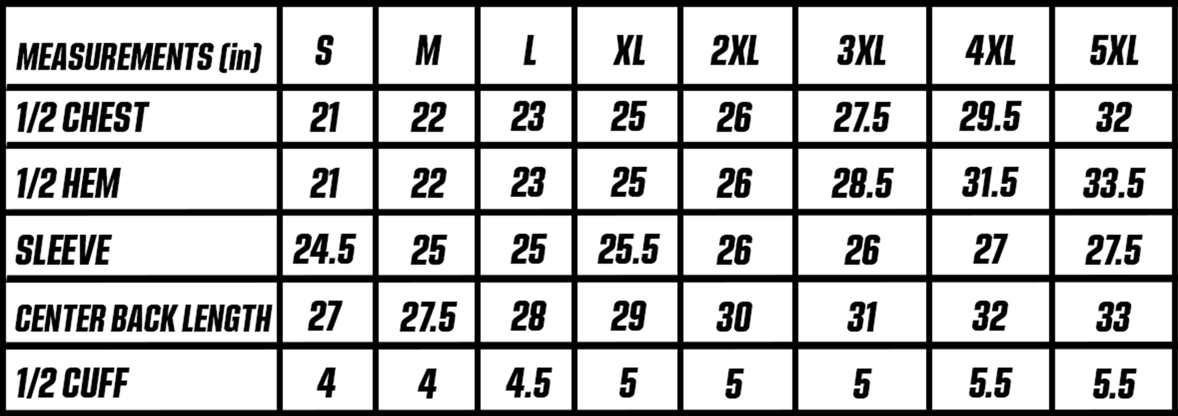 Sizes: Small – 5XL – Measurements should be allowed about .33in of tolerance